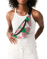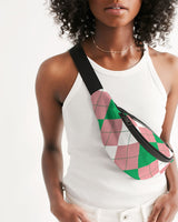 Sling belt bag with zipper openings and featuring Pretty Girl Argyle print. Bag can be worn around the waist or over the shoulder as a sling style.