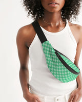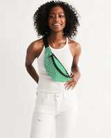 Sling belt bag with zipper openings and featuring Pretty Parisian Viridi print. Bag can be worn around the waist or over the shoulder as a sling style.