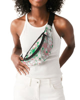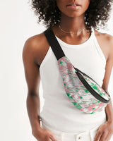 Sling belt bag with zipper openings and featuring Glitched Plaid Nivea print. Bag can be worn around the waist or over the shoulder as a sling style.