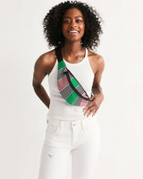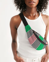 Sling belt bag with zipper openings and featuring Pop Blocco print. Bag can be worn around the waist or over the shoulder as a sling style.