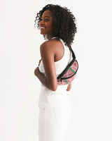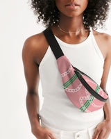 Sling belt bag with zipper openings and featuring Heritage Stripes & Links Rosea print. Bag can be worn around the waist or over the shoulder as a sling style.