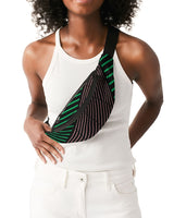 Sling belt bag with zipper openings and featuring Crossing Lines Atera print. Bag can be worn around the waist or over the shoulder as a sling style.
